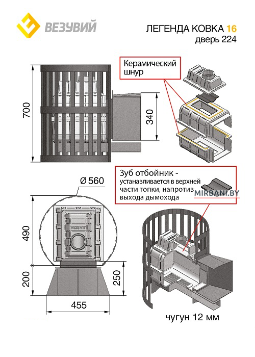 Банная Чугунная печь ЛЕГЕНДА Ковка 16 (224) укомплектована чугунной герметичной, самоохлаждаемой дверцей (посадочный размер 330х410) с жаропрочным стеклом «SHOT ROBAX» и кованным конвекционно-вентилируемый кужухом.