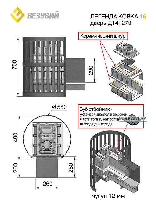 Банная чугунная печь Везувий Легенда Ковка 16 (271) - печь для парной с объемом от 8 до 16 м.куб. укомплектована топочной глухой чугунной дверцей и кованным конвекционно-вентилируемым кожухом. Печь-сетка с большой загрузкой камней, выносная топка позволяет протапливать печь из соседнего с парной помещения. Большая масса камней позволяет надолго сохранять тепло после угасания огня в топке печи, также камни экранируют инфракрасное излучение исходящее от раскаленной топки печи.